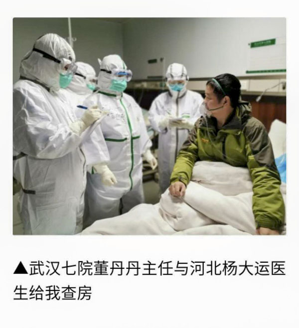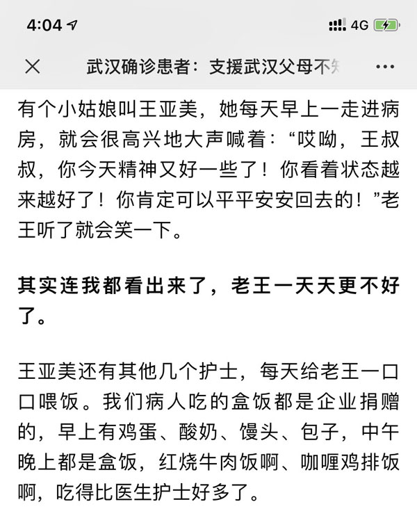 这是我院90后美小护王亚美的一篇心情日记,寥寥几句概括了她在武汉抗疫一线23天的生活和工作,看似轻松的背后是无尽的汗水和艰辛的努力。年纪轻轻的她,和伙伴们一起,用自己的爱心、耐心和细心对待每一位患者,文中的“王叔”就是这其中的一位。恰好一篇收录于“百家号抗击新型肺炎专题人物栏目#战疫日记#”中的患者自述,也写到了她们的事迹,在这位患者的日记中,同在武汉一线的我院杨大运和王亚美她们一起,被称为“神仙妹妹”。