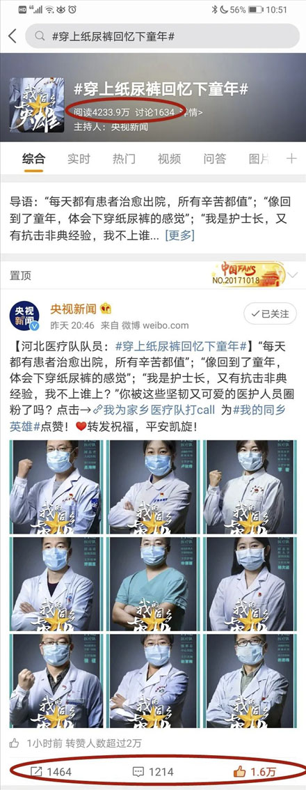 3月3日晚上20点46分,央视新闻官方微博号以我院重症医学科副护士长申康康接受采访时说的“挺好的,像回到了童年,还可以体会一下穿纸尿裤的感觉”形成微博超话:#穿上纸尿裤回忆下童年#,瞬间引起强烈反响。