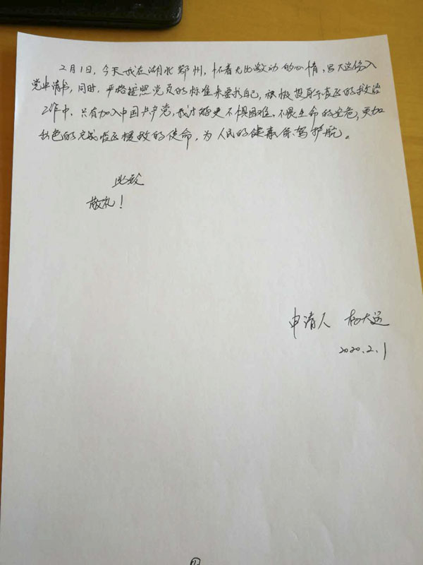带着对党组织的崇敬和向往,21日,杨大运同志向中共河北援鄂医疗队党总支提交了入党申请书。212日,我院党委同意确定其为入党积极分子。36日,河北省援鄂抗疫第一、二批医疗队医疗救治二支部提出发展杨大运同志为预备党员,317 日,河北省卫健委机关党委审批通过,318日,河北省援鄂抗疫第一、二批医疗队医疗救治二支部接收杨大运同志为预备党员,杨大运同志在武汉一线对党庄严宣誓。