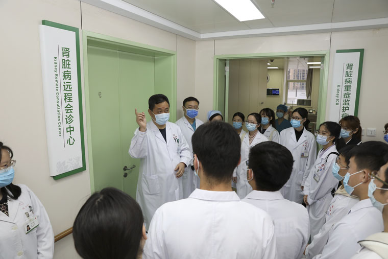 徐金升教授带领学生们参观肾内科病区,医护老师们热情地接待了这些“好奇宝宝”,为他们介绍了肾内科的科室建设、肾病学的学科特点,还详细地讲解了肾内科科徽和“崇德尚道、谨修慎行”的科训,引导学生在病区内近距离观察医生的工作过程,加深同学们对未来职业的认识和体会。肾脏病重症监护病房、肾脏病实验室、血液透析中心、慢性肾病管理中心等是教科书中的“未知领域”,这种“神秘感”增强了学生们对于知识的兴趣与热情。参观结束后,徐金升教授对同学们提出希望,要建立以疾病为导向、由案例入手的学习模式,保持孜孜不倦的学习状态,在增加专业知识储备的同时不要忘记融入对医学人文的探讨,努力提高自己的人文修养。愿大家回首今日,以梦为马,不负韶华。”