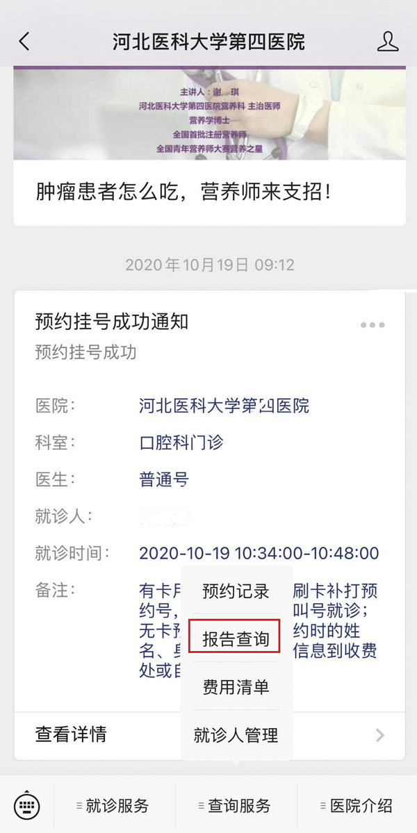 患者通过关注微信公众号,点击“查询服务”----“报告查询”,选择要查询的就诊人,点击需要查看的报告类别,便可看到相应的报告单结果。患者可以减少排队等待取报告的步骤,系统还增加了检查报告提醒功能,患者能更快捷地看到报告单。