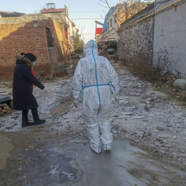 由于村庄里气温特别低,地上有点水就立马结成冰,穿着隔离衣和鞋套挨家挨户去入户采集的时候,走在上边就特别容易摔跟头,但是队员们还是克服困难,保证每个人都采集到。