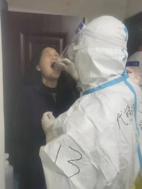 为了避免交叉感染,减少近距离接触,队员们尽可能不进入屋内,在门口逐户采集。小区内独居老人多,大多使用老年手机甚至不会使用微信注册信息,导致采集工作进行缓慢。队员们有条不紊、逐一讲解,有的用自己的手机帮助注册,从而保证每位居民都能顺利完成核酸检测。在采集过程中,队员们积极宣传防疫知识,对居民戴口罩进行规范指导。透过防护口罩和面屏,队员们说话的声音变得有些沉闷,“别紧张,放松,头再仰高一点......”,居民们对她们周到的服务连连感谢。晚上9点,采集工作圆满结束,共采集标本3369个。随后,又进行试管清点核对、接收清点防护物资。当回到住处时,已到深夜11点多,很多人的腿酸疼得迈不开步子。