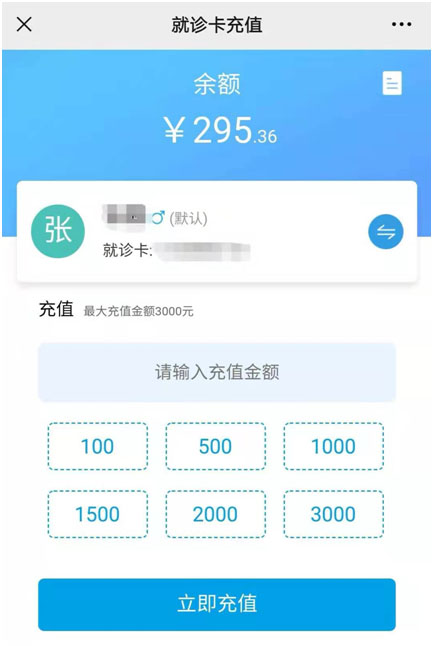 在“就诊卡充值”界面,显示就诊人姓名和就诊卡号,表示就诊卡与微信公众号已绑定。