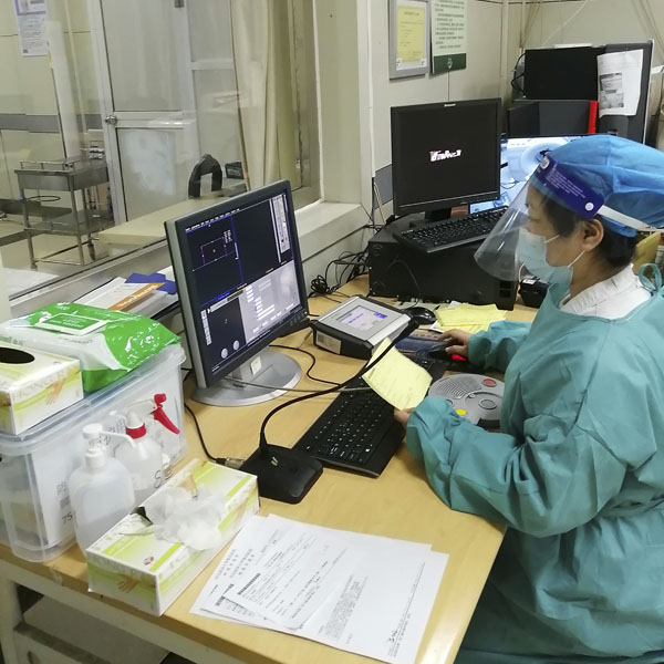 放射科殷风华在东院ICU病区进行床旁检查。