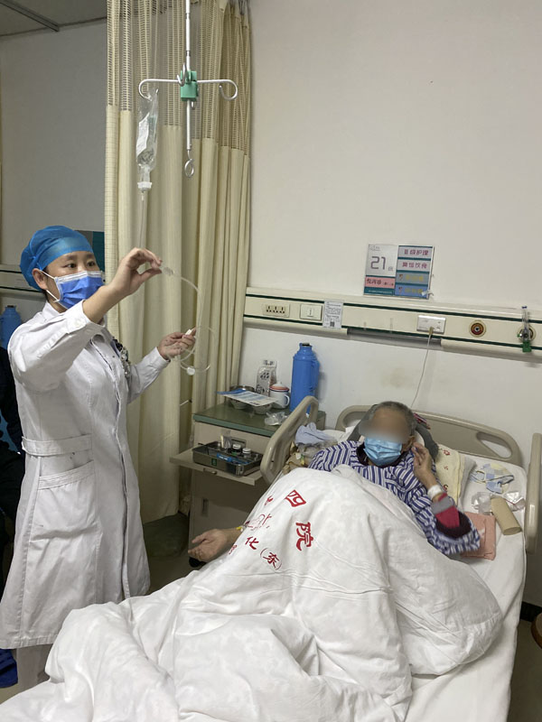 妇科二病区的杨倩为患者维护中心静脉导管。