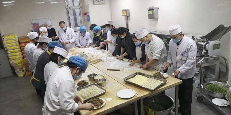面对全市居民居家隔离,人员、车辆出入严格管控等现状,膳食部成员克服困难,全力投入紧张的工作中。采购员、库管员和供货商密切保持联系,及时补充库存量。随着物资需求的剧增,供货商每天穿梭于市内各大批发市场、超市采进行采购。采购员、库管员随时验收送来的粮食、蔬菜、肉类等物品,检验合格后立即送往食堂或储存。服务员和厨师们整天都在摘菜、洗菜、切配、炒菜、分发,一条生产链上的人员都在忙碌着……馒头等主食需求量非常大,面点师每日早上4点半就开始蒸馒头,中午也不停歇,一直干到晚上8、9点。