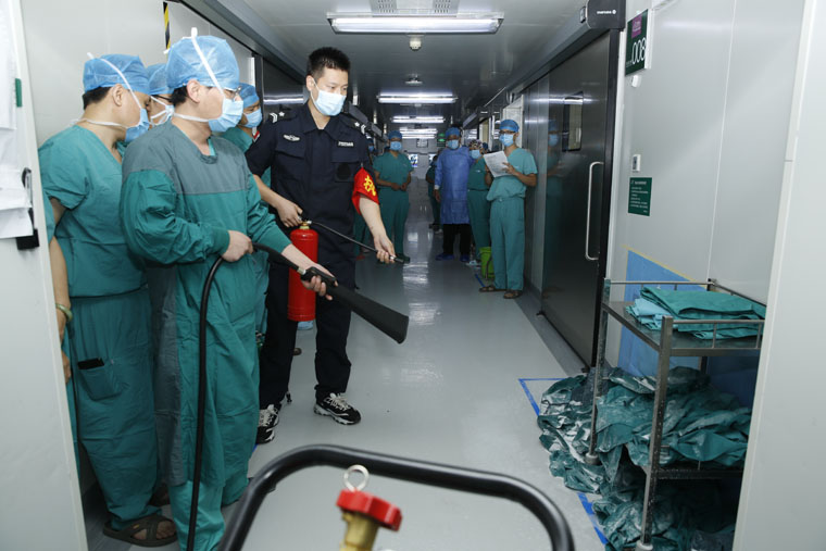 “着火了,着火了!门口起火,大家保持镇静,不要慌张……”7月20日上午8点,东院区手术室、麻醉科及肝胆外科、乳腺外科20名医护人员在手术室进行的术中火灾应急消防演练。