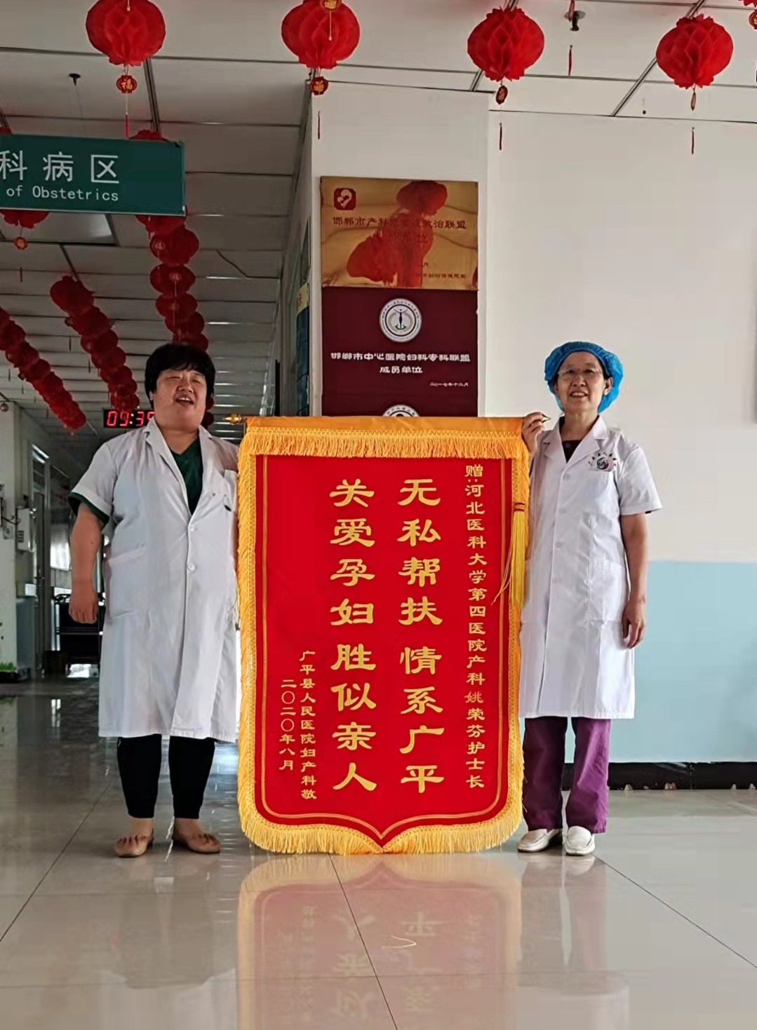 2019年8月到2021年8月,产科姚荣芬副主任护师连续两年深入广平县人民医院进行帮扶,协助开展了自由体位分娩、适度会阴保护技术等,使产妇在舒适中分娩。她通过示教、讲座等形式对科室人员进行专业培训,讲解新生儿窒息复苏知识、难产知识并进行技术操作培训,传授新生儿早期肌肤接触、晚断脐的新理念。她的工作和付出得到了很多产妇和家属的认可,被赠送了锦旗。当地医院领导对姚荣芬所作出的贡献表示高度称赞,以广平县人民医院的名义向她赠送锦旗。