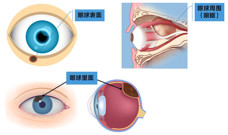眼肿瘤包括眼睑、结膜、眼内、泪器、眼眶肿瘤。眼睑恶性肿瘤常见基底细胞癌,睑板腺癌、鳞状细胞癌和黑色素瘤,良性肿瘤常见于色素痣和血管瘤;眼眶肿瘤包括淋巴瘤、腺样囊性癌、海绵状血管瘤、神经鞘瘤、神经纤维瘤等;眼内肿瘤以恶性多见,主要见于视网膜母细胞瘤、脉络膜黑色素瘤、脉络膜转移癌等。