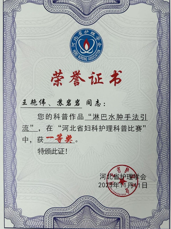11月9日—11日,河北省护理学会妇科专业委员会在石家庄市召开“河北省妇科护理新进展研讨会暨盆底康复技术研讨会”。会议前期面向全省征集优秀科普作品,共78个作品入围复赛,经过激烈的角逐,我院妇一科王艳伟、苏岩岩的作品《淋巴水肿手法引流》和李玥的作品《女性“生育之敌”巧克力囊肿》脱颖而出,分别在决赛中获得一等奖和二等奖的优异成绩。