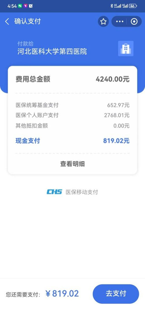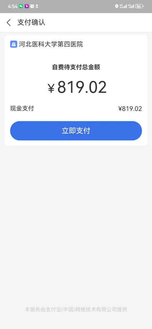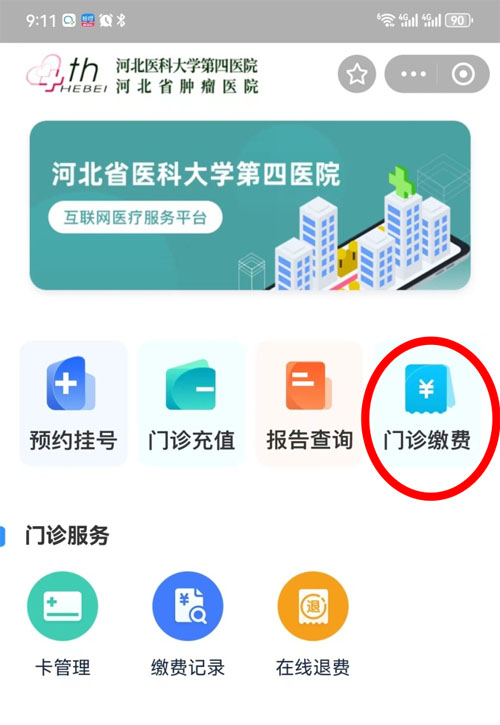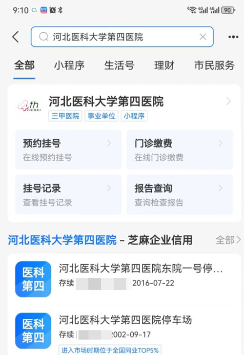 在支付宝小程序里搜索“河北医科大学第四医院”。