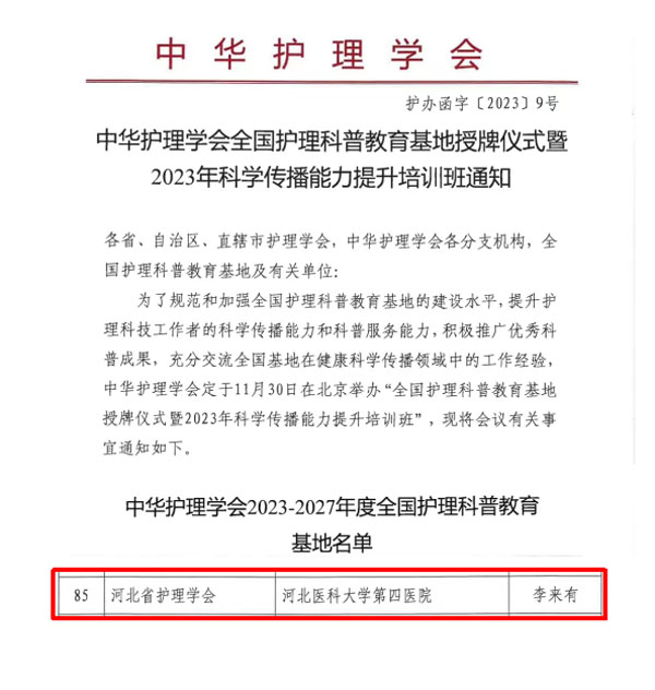 近日,我院被中华护理学会授予“全国护理科普教育基地”,4个中华护理学会专科护士/专项培训临床教学基地通过复审,新增2个中华护理学会专科护士/专项培训临床教学基地,充分体现了中华护理学会对我院护理科普宣传教育工作和临床教学工作的肯定。