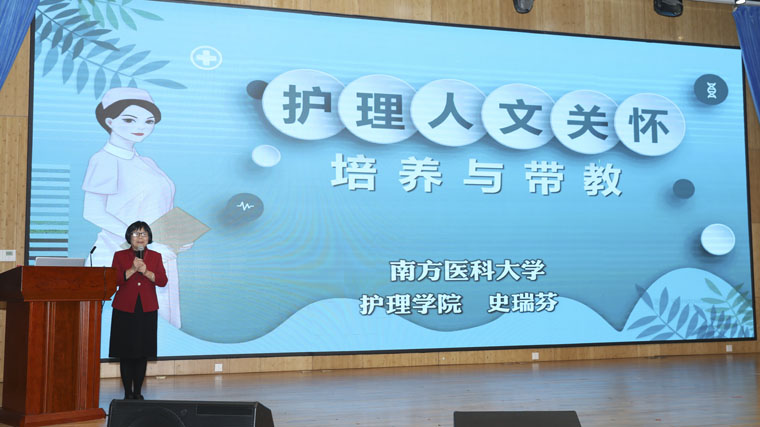 史瑞芬教授以《护理人文关怀培养与带教》为题进行专题讲座。她用幽默风趣的语言和贴近临床的案例,深入浅出地阐述了护理人文关怀的重要性及其培养方法,受到大家的一致好评。