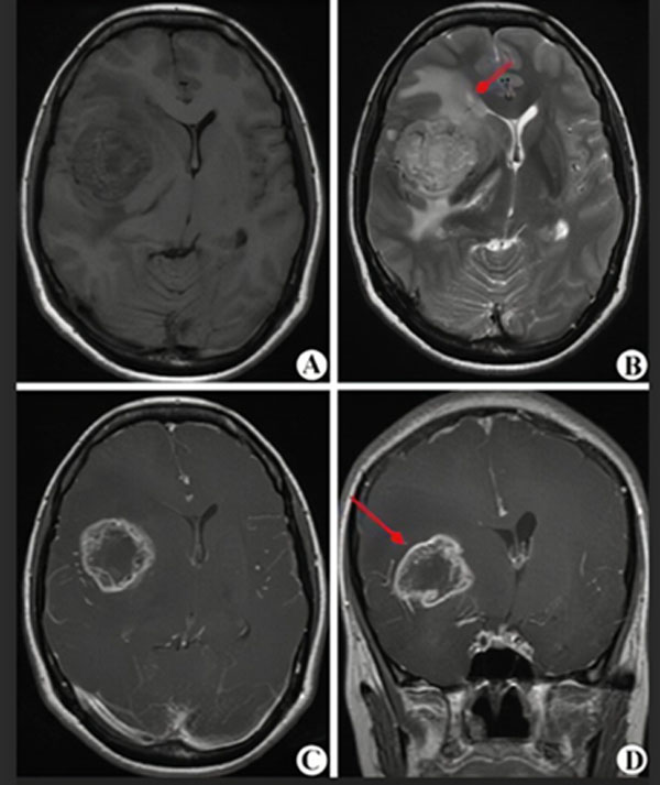 (图A-D显示为高级别胶质瘤的核磁表现,红箭头指示肿瘤所在)
