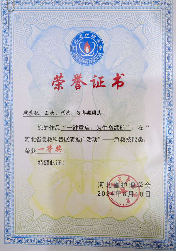 8月8-10日,由河北省护理学会主办的“河北省急救科普展演推广活动”决胜赛在石家庄举办,东院急诊科韩彦敏、王欢、代果、刁志超的作品《一键重启,为生命续航》在“急救技能”板块中勇夺一等奖;本部急诊科钱勇、张宁、郭伟娜、赵思安的作品《生命热线-如何正确拨打120》在“健康素养及灾害防范知识”板块中获得二等奖。