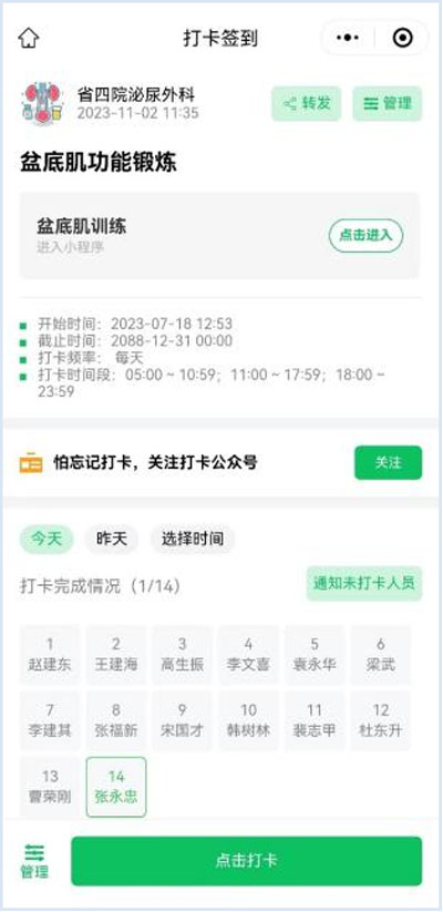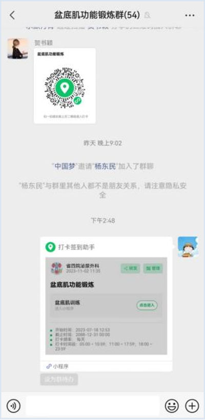 术前,医护共同向患者介绍尿失禁的风险、原因及功能锻炼的重要性,教会患者盆底肌功能锻炼及膀胱功能训练的具体方法。科室创新采用信息化手段,制作功能锻炼打卡小程序,患者可跟随小程序中的音频口令边听音乐边进行锻炼,提升乐趣的同时更易患者坚持,锻炼后点击打卡可让医务人员了解实际情况。