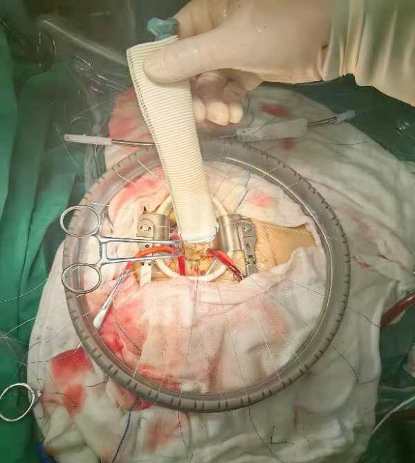 一般来说,“主动脉瓣和升主动脉置换+冠脉移植术(Bentall术)”需对主动脉根部进行一系列复杂操作及缝合,充分的手术视野暴露对手术成功起着至关重要的作用。如果通过小切口进行,对术者的心理及能力是个极大的考验,省内暂无此方面的借鉴经验,国内可参考的资料也有限。面对病人的期盼,心脏血管外科团队多次研判检查结果,查阅相关资料,结合既往开展的微创主动脉瓣替换手术经验,最终决定为患者施行微创手术。为保证手术的顺利,术前心血管外科会同手术室、麻醉科、体外循环小组等相关医务人员详细讨论患者病情,评估术中可能出现的风险,并制定详细的防范及应对方案,确保手术安全。