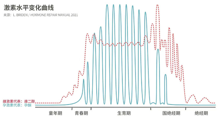 生育期也被称为性成熟期。由于卵巢周期性的排卵,雌孕激素相应的也就有了周期性的变化,这直接体现在了规律的月经上。每一个月经周期都会经历以下的过程,周而复始:随着卵泡发育,雌激素逐渐分泌增加,直至卵泡成熟时雌激素分泌达到顶峰;排卵后雌激素水平下降,继而黄体生成,孕激素水平升高;当黄体衰退不再分泌雌孕激素时月经来潮。