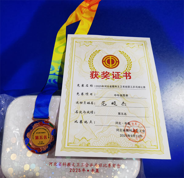 9月9-12日,2025年河北省教科文卫系统职工乒乓球比赛在辛集举办,赛事由省教科文卫工会主办、辛集市总工会承办。我院工会积极组织、精心筹备职工参赛,荣获“优秀组织奖”骨科范晓杰中年男子组单打项目中位列第五名。