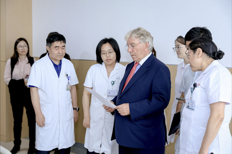 会前,Untch教授先后走访了东院区放疗科、病理科及乳腺中心临床研究病房。在放疗机房,他与医护团队围绕乳腺癌、宫颈癌患者放射治疗方案展开实时病例研讨;在河北省数智病理中心,对该中心基于超千万张病理图像构建的高质量数据集及高效处理多类临床诊断任务的AI模型给予高度评价,并肯定了远程病理会诊平台的建设成果。随后,Untch教授深入临床研究病房,对三位年轻晚期乳腺癌患者进行教学查房,以严谨的学术态度和人文关怀与患者沟通病情,提出国际化治疗建议,其专业素养获医患一致赞誉。