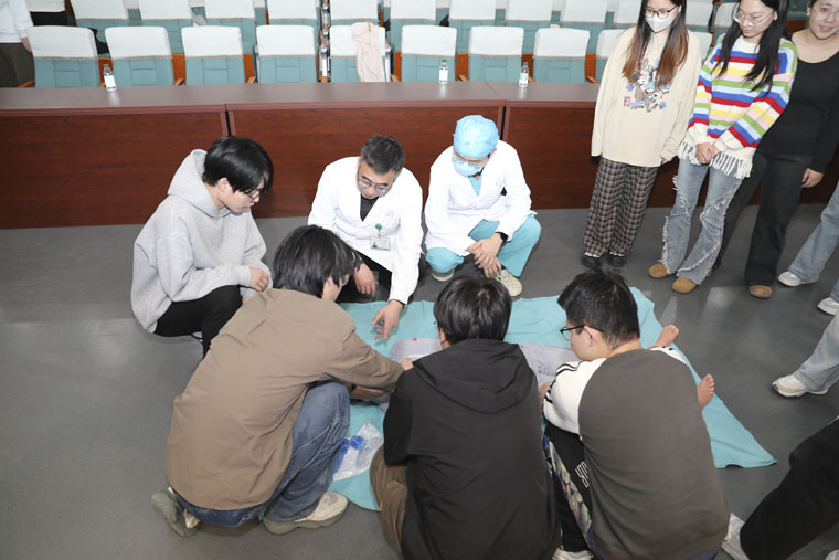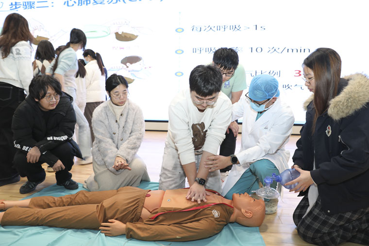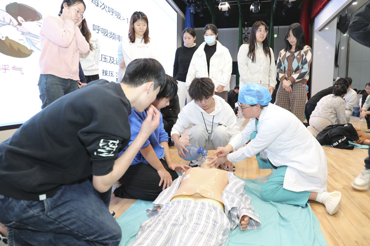 近日,我院麻醉学系和教务处联合麻醉学教研室、内科学教研室在东院区报告厅举办了心肺复苏公益培训活动,主题为“授业之心,点亮生命”。活动以2022级麻醉本科生的一堂内科学急救课程为主线,创新将临床理论教学、实操技能训练与社会责任培育深度融合,旨在打造一堂兼具专业性与人文温度的生命教育特色课程。