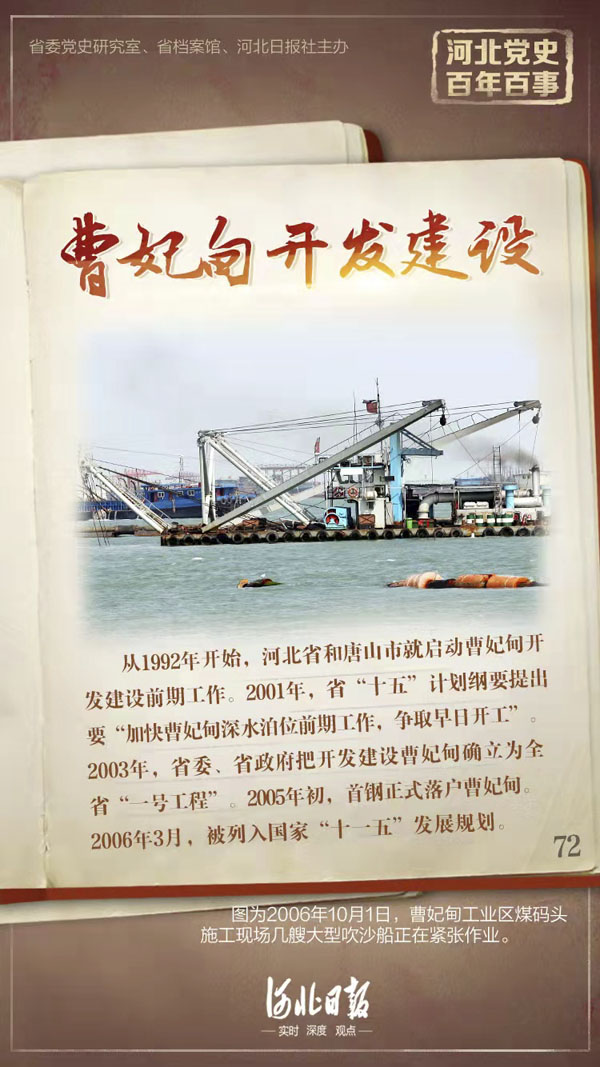 曹妃甸位于唐山南部沿海、渤海湾中心地带,“面向大海有深槽,背靠陆地有浅滩”的自然地理特征,为大型深水港口建设和临港产业发展提供了优越条件。从1992年开始,河北省和唐山市就启动曹妃甸开发建设前期工作。2001年,省“十五”计划纲要提出要“加快曹妃甸深水泊位前期工作,争取早日开工”。2002年,唐山市委市政府明确将曹妃甸工程确立为全市“四大兴市工程”之首,举全市之力开发建设。2003年,省委省政府把开发建设曹妃甸确立为全省“一号工程”。2004年底,国务院原则通过包括曹妃甸进口矿石码头、原油码头在内的《渤海湾区域沿海港口建设规划》。2005年初,国家发改委正式批复《关于首钢实施搬迁、结构调整和环境治理的方案》,首钢正式落户曹妃甸。2005年10月,曹妃甸工业区被列为国家第一批发展循环经济试点产业园区。2006年3月,被列入国家“十一五”发展规划。