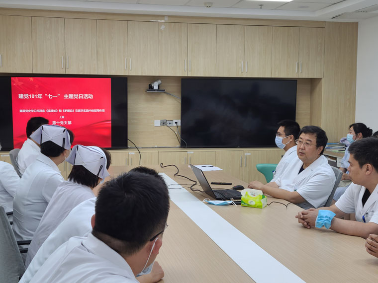 为庆祝建党101周年,近日,第10党支部开展主题党日活动,支部书记赵瑞力以“重温党史——学习《实践论》和《矛盾论》在医学实践中的指导作用”为题,为全体党员和入党积极分子上了一堂生动的主题党课。