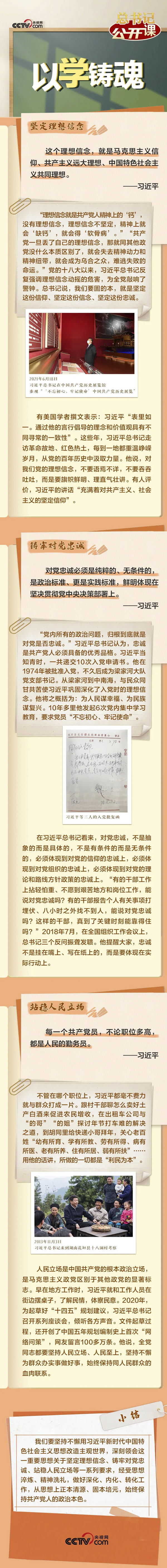 “以学铸魂,就是要做好学习贯彻新时代中国特色社会主义思想的深化、内化、转化工作,从思想上正本清源、固本培元,筑牢信仰之基、补足精神之钙、把稳思想之舵。”今年4月,习近平总书记在广东考察时围绕“以学铸魂”提出明确要求,强调“坚定理想信念”“铸牢对党忠诚”“站稳人民立场”。